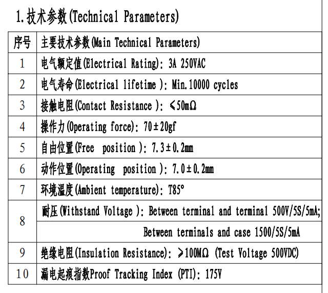 ພາຣາມິເຕີ Micro Switch (ຂໍ້ມູນຈໍາເພາະ)
