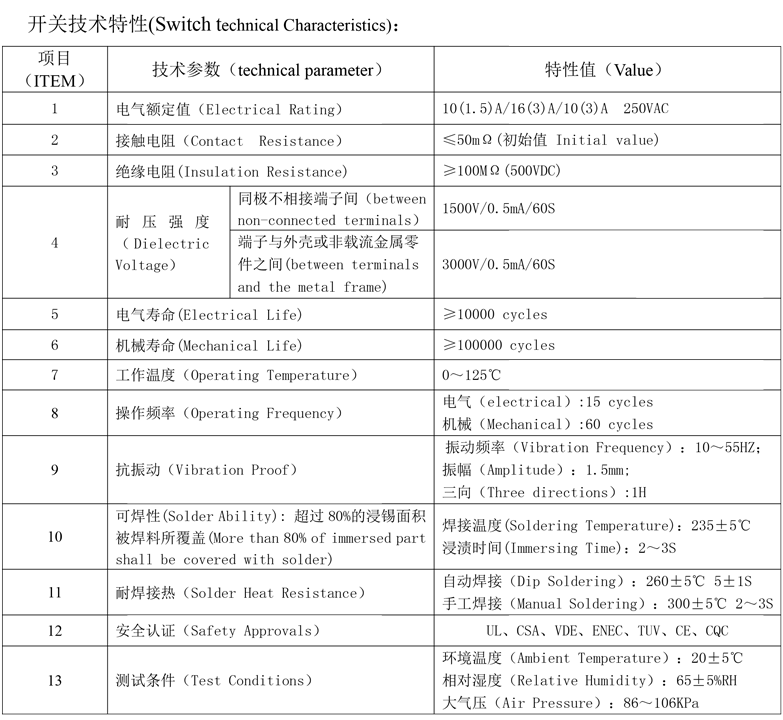 | 1 | ການໃຫ້ຄະແນນໄຟຟ້າ | 10 (1.5) A / 16 (3) A / 10 (3) A 250vac | |