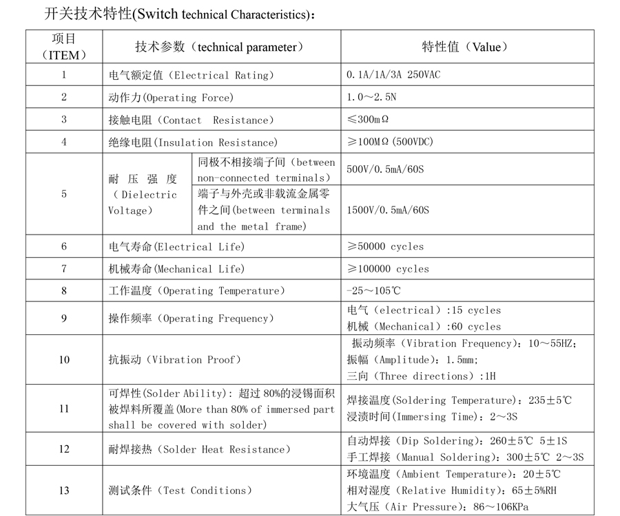 | 13 | ເງື່ອນໄຂການທົດສອບ | ອຸນຫະພູມອາກາດລ້ອມຮອບ: 20 ± 5 ℃ ຄວາມຊຸ່ມຊື່ນທີ່ກ່ຽວຂ້ອງ: 65 ± 5% rh 0.1A / 1A / 3A 250VAC |